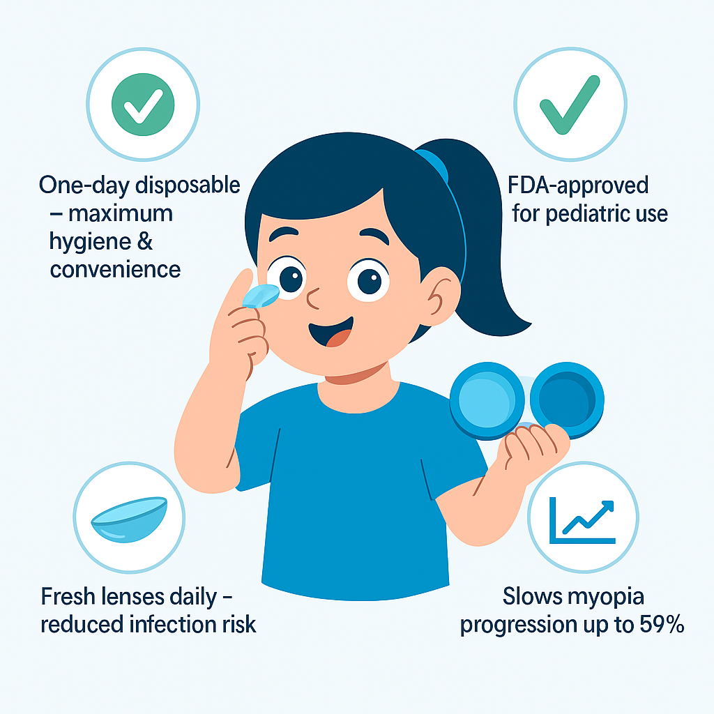 Modern myopia management contact lenses, including one-day disposable contact lenses, are specifically designed for children’s eyes and have been proven safe and effective in clinical studies.